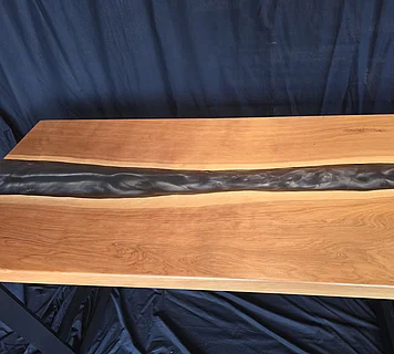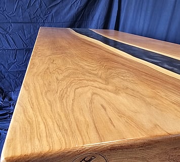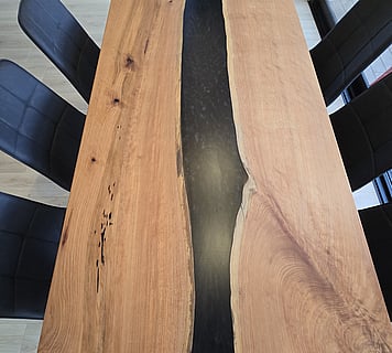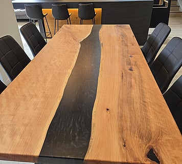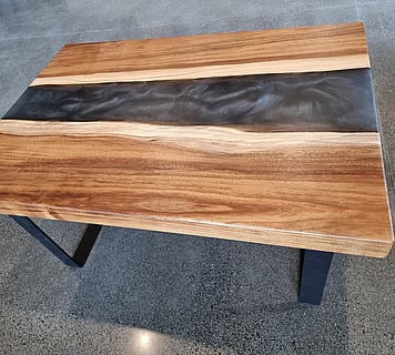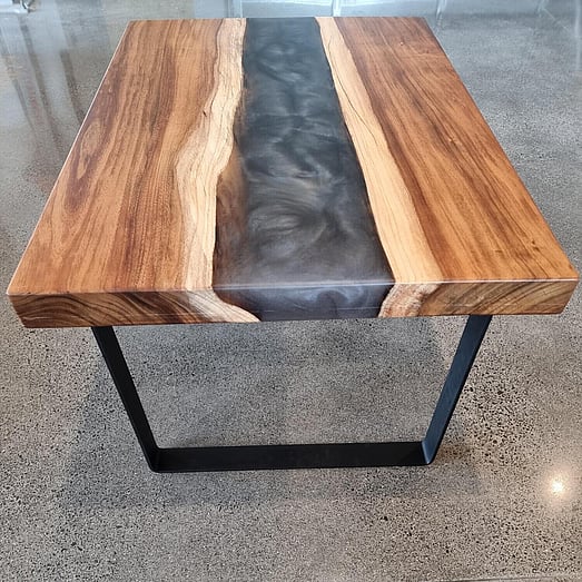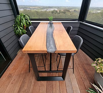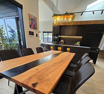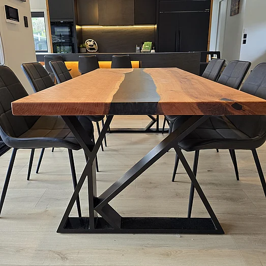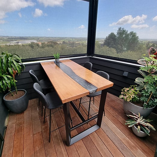 New Zealand Macrocarpa dining table with black powder-coated aluminium legs. Hand made in our workshop, the Macrocarpa table top was router flattened and hand-oiled. The Moderno dining table is suitable for 6 to 8 seats and is available with or without chairs (imported).